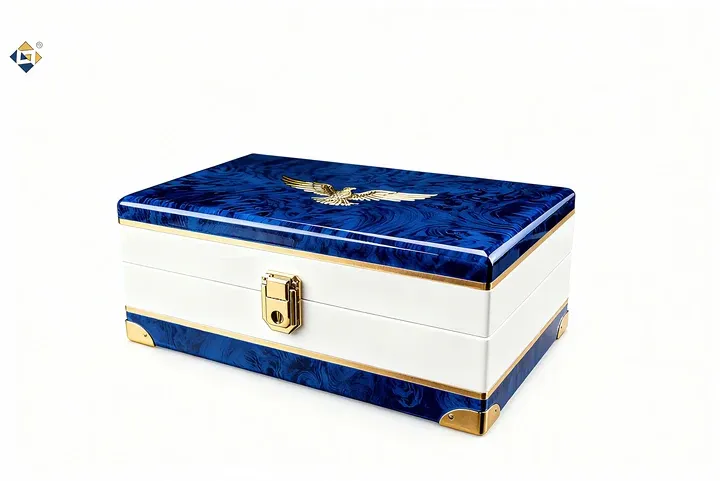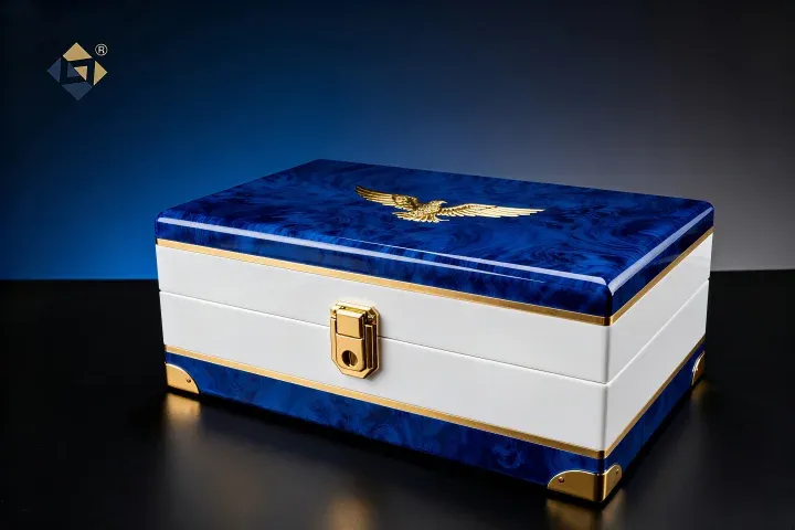 Creative Packing's cigar boxes feature a high-gloss piano lacquer finish, with a blue and white exterior accented with gold hardware, exuding a luxurious feel. The interior is lined with Spanish cedar wood, which not only maintains optimal humidity and aroma for cigars but also acts as a natural insect repellent. The gold-inlaid vents and eagle emblem add a touch of strength and elegance to the overall design.